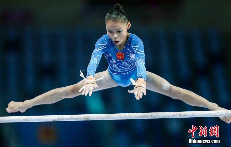 9月23日,仁川亚运会女子体操个人全能决赛中,中国选手姚金男以57.900分获得冠军,商春松以56.95分摘得银牌,铜牌被韩国选手Yun Narae获得,成绩是55.000分。图为商春松在高低杠比赛中。中新社记者 张浩 摄