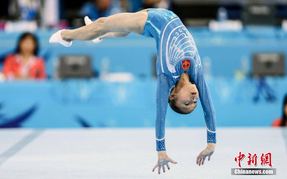 9月23日,仁川亚运会女子体操个人全能决赛中,中国选手姚金男以57.900分获得冠军,商春松以56.95分摘得银牌,铜牌被韩国选手Yun Narae获得,成绩是55.000分。图为商春松在自由体操比赛中。中新社记者 张浩 摄