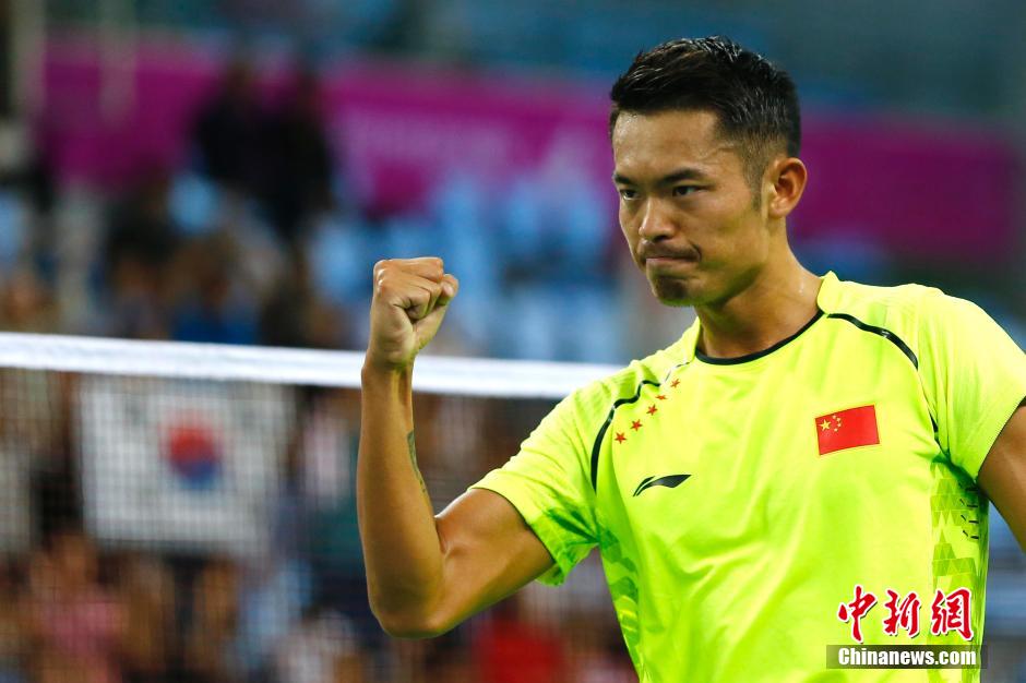 9月23日,仁川亚运会羽毛球男子团体决赛在桂阳体育馆打响。在第三场单打比赛中,中国队林丹(图)以2:0横扫李东根,为中国队扳回一分,但中国目前总比分仍落后一分。中新社记者 富田 摄