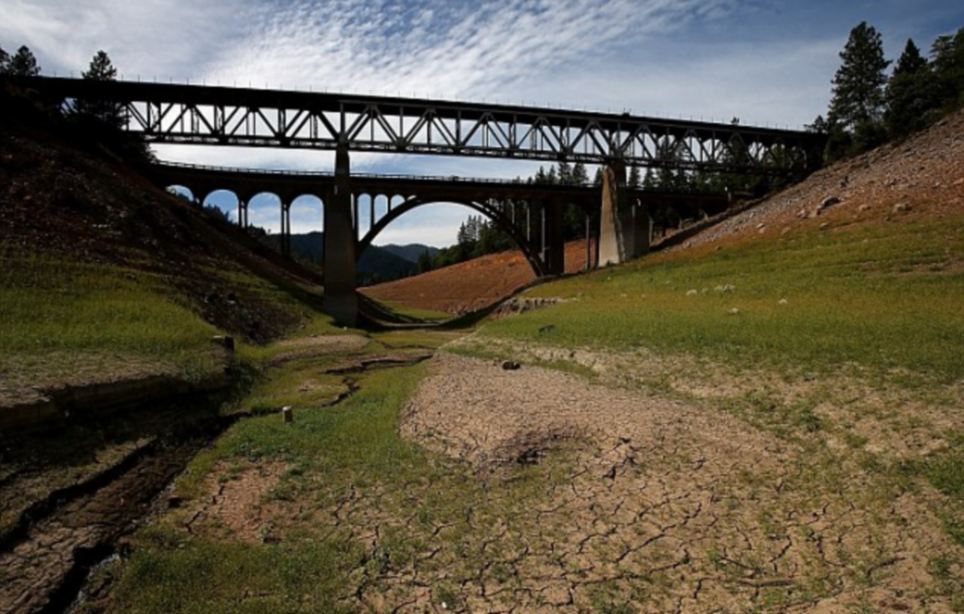 横跨沙斯塔湖的大桥下面水已经干涸。连续3年大旱导致加州湖泊、水库水位下降至历史最低水平。