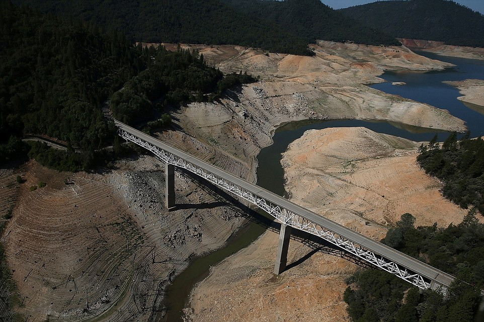 这是2014年“企业桥”横跨过的奥罗维尔湖,储水量大幅下降,加州被迫发出警报。