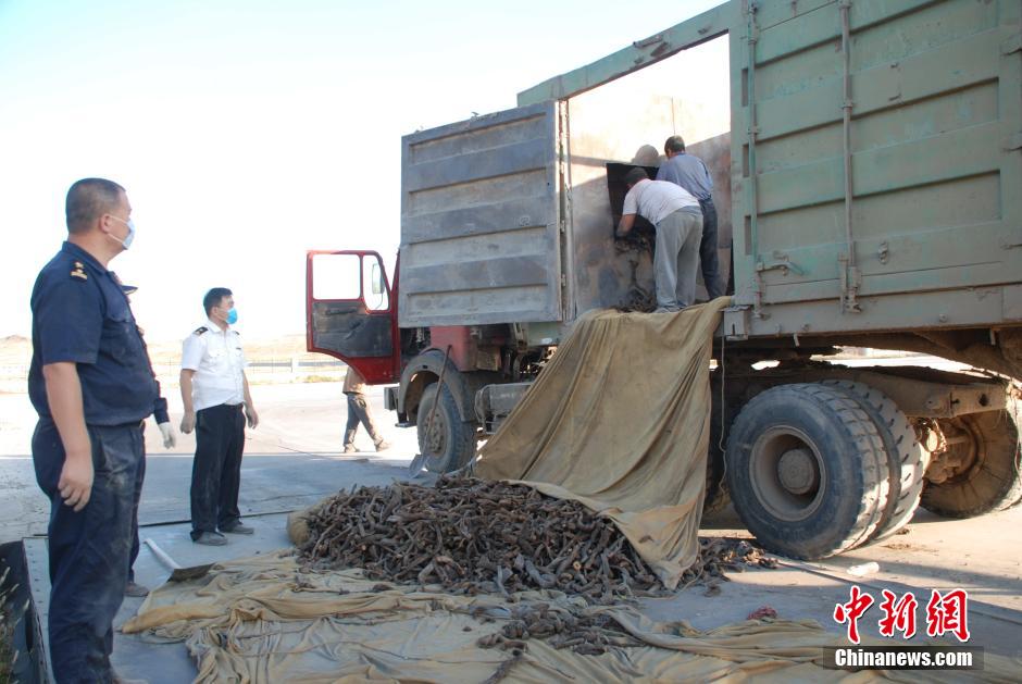 9月4日,呼和浩特海关在中蒙珠恩嘎达布其口岸查获三辆入境货车利用车厢改造夹层藏匿走私国家二级保护动物黄羊角1.43吨(共计14597根)、苁蓉5.05吨,羊肚、羊肠衣、马板肠等冻品约17吨,案值共计400万元,偷逃税款30余万元。共抓获犯罪嫌疑人6名,其中蒙古国籍犯罪嫌疑人3名。图为现场关员监督犯罪嫌疑人卸取走私物品。中新社发 呼和浩特海关 供图