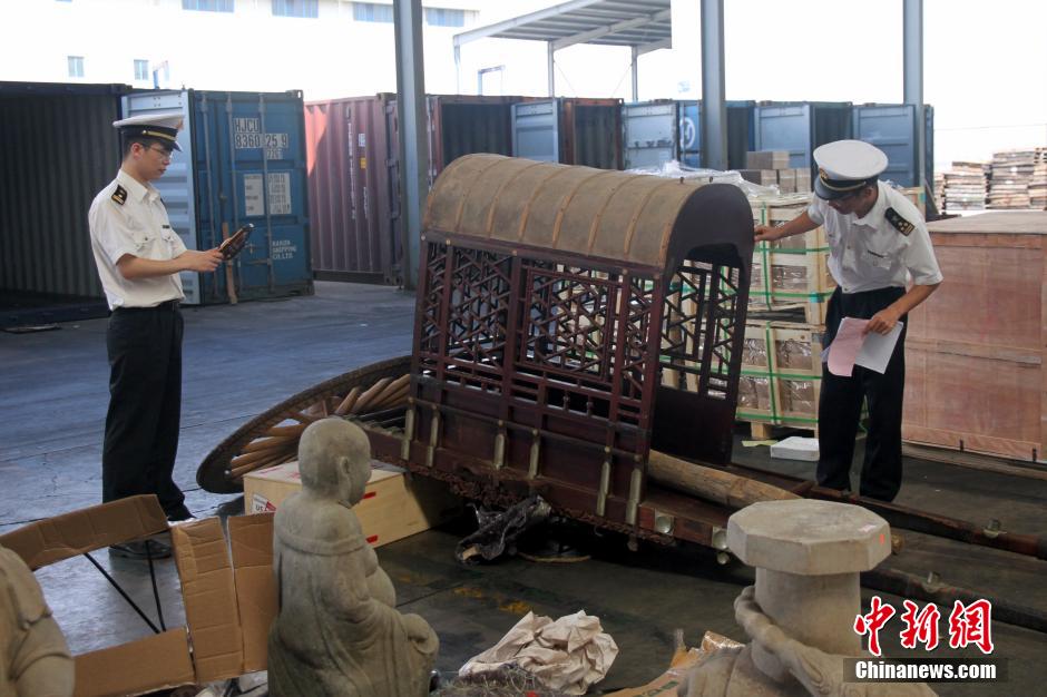 宁波海关近日查验了一批特殊的进口货物——清代文物。这批文物是由宁波市鄞州区一家古典家具公司自美国进口的,共有“清代雕刻石狮”、“清代石雕窗花板”、“清代木制带铜件马车”、“清代石雕佛像”等34件货物。这是宁波口岸今年首批申报进境的文物。据该企业老板介绍,文物是中国历史文化的传承,应该带其“回家”。图为浙江宁波海关查验关员查验清代木制带铜件马车。中新社发 洪莹 摄