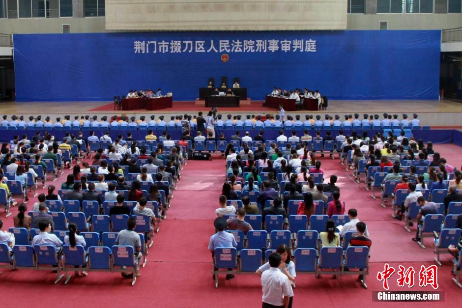 9月23日,湖北省荆门市掇刀区人民法院在荆门市体育文化中心公开开庭审理蒋某、邹某等22人涉嫌组织、领导、参加黑社会性质组织案件。2013年3月24日,一男子在掇刀亿达花园小区门前被多名男子持刀砍伤。警方在侦查中发现荆门城区2个违法犯罪团伙纠集,逐渐形成一个组织严密,成员固定,层级分明的黑社会性质犯罪团伙,警方在侦办案件中共查获气枪一把、砍刀57把。团伙配备有车辆、对讲机等设备,并提供食宿和发放费用。2013年8月,警方将该团伙主要骨干成员一网打尽。由于涉案人员众多,该案预计将审理3天。图为庭审现场。中新社发 吴奇勇 摄
