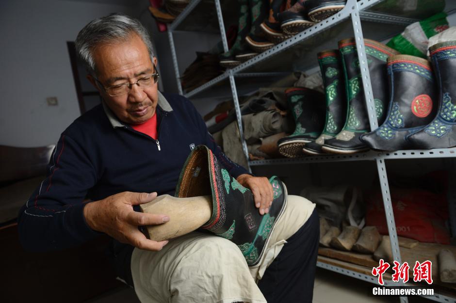 9月23日,传统蒙古族皮靴手工制作技艺传承人吴润达制作皮靴,将靴头放进靴子内塑型。据悉,吴润达的蒙古族皮靴制作技艺曾被授予内蒙古与呼和浩特的非遗传承人荣誉,制作时需要打衬子、捏千层等50道工序,皮靴材质以牛皮为主,也用羊皮与股子皮,吴润达师傅家五代祖传,老人现在71岁,在15岁时就和父亲学习做靴子,不过现在已经很少制作。吴师傅坦言,制作一双靴子约半个月时间,出售约一千五百块一双,费力费时,销售也不好,现在没有徒弟,他悲观的认为这门手艺将失传。刘文华 摄