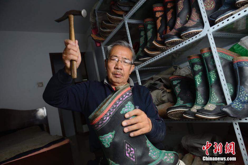 9月23日,传统蒙古族皮靴手工制作技艺传承人吴润达制作皮靴,将靴头等放进靴子后用锤子敲打塑型。据悉,吴润达的蒙古族皮靴制作技艺曾被授予内蒙古与呼和浩特的非遗传承人荣誉,制作时需要打衬子、捏千层等50道工序,皮靴材质以牛皮为主,也用羊皮与股子皮,吴润达师傅家五代祖传,老人现在71岁,在15岁时就和父亲学习做靴子,不过现在已经很少制作。吴师傅坦言,制作一双靴子约半个月时间,出售约一千五百块一双,费力费时,销售也不好,现在没有徒弟,他悲观的认为这门手艺将失传。刘文华 摄