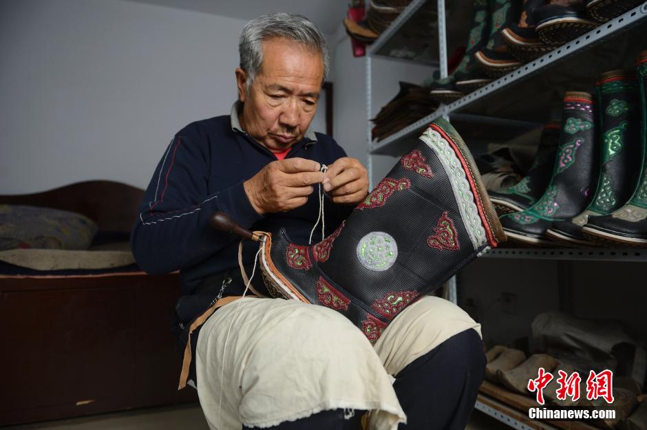 9月23日,传统蒙古族皮靴手工制作技艺传承人吴润达制作皮靴,上靴子步骤。据悉,吴润达的蒙古族皮靴制作技艺曾被授予内蒙古与呼和浩特的非遗传承人荣誉,制作时需要打衬子、捏千层等50道工序,皮靴材质以牛皮为主,也用羊皮与股子皮,吴润达师傅家五代祖传,老人现在71岁,在15岁时就和父亲学习做靴子,不过现在已经很少制作。吴师傅坦言,制作一双靴子约半个月时间,出售约一千五百块一双,费力费时,销售也不好,现在没有徒弟,他悲观的认为这门手艺将失传。刘文华 摄