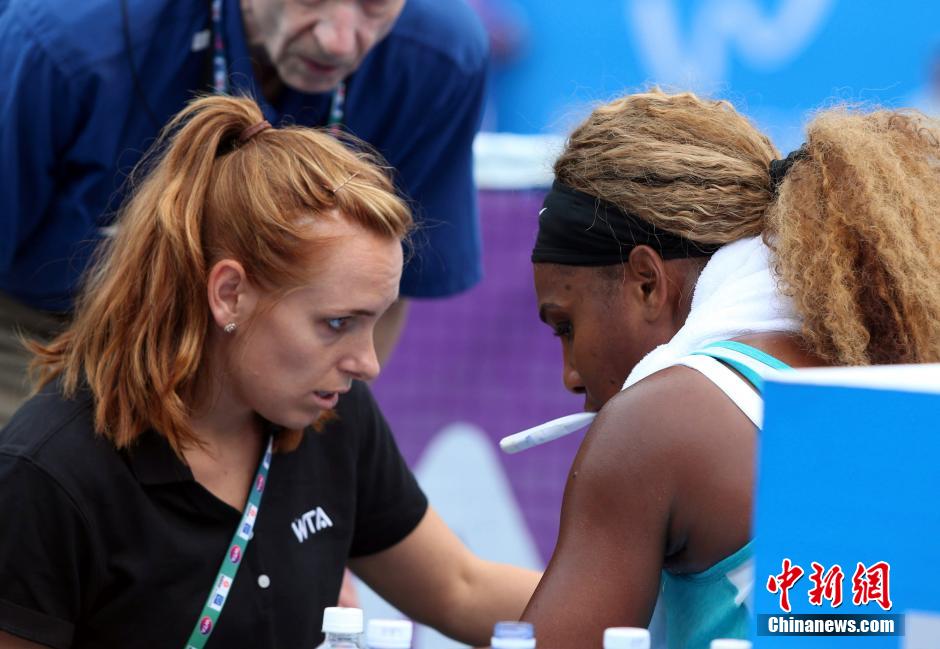 9月23日,WTA武汉网球公开赛继续进行女单次轮比赛的争夺。在当日下午时段最后一场比赛,头号种子小威廉姆斯在首盘6:5领先的情况下身体不适退赛,对手科内特晋级16强。图为小威比赛中身体不适,接受治疗。中新社发 张畅 摄