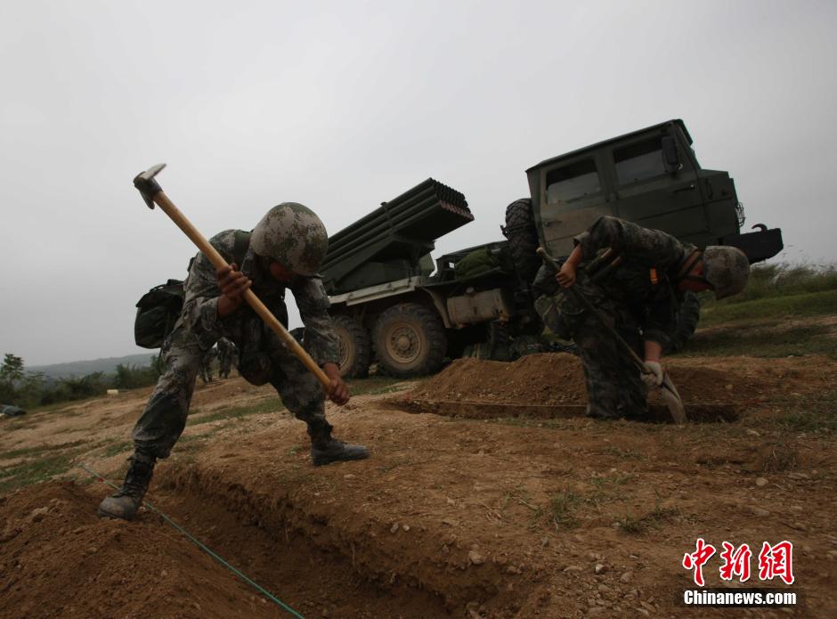 9月23日,正在南京军区三界训练基地进行“火力-2014·三界”兵种部队跨区演习的官兵构筑火炮工事,做好射击准备。解放军总参谋部今年集中组织兵种部队跨区基地化训练,这在中国军队军事训练领域还是首次,是一种新的组训模式。从7月到9月,来自沈阳军区、北京军区、济南军区、南京军区、广州军区、成都军区的10个炮兵旅、远火旅和防空旅,分别跨区参训,而空军航空兵、陆航、电子对抗等部队的参演,使得这次训练具有参训部队多、跨区地域广、机动距离远、实弹射击量大和多军兵种协同的特点。由济南军区某炮兵旅参演的“火力-2014·三界”演习,是其中的收官之作。中新社发 徐宁 摄