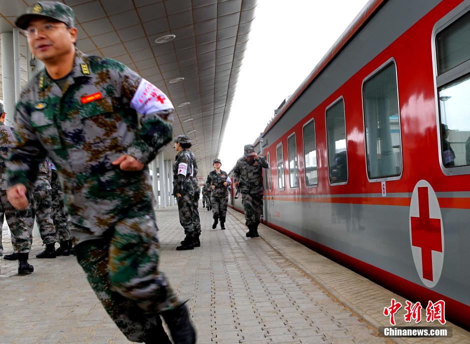 9月23日,解放军代号“卫勤使命——2014”的信息化条件下实兵对抗卫勤保障演习拉开序幕,各参演部队在朱日和训练基地正有序展开训练。演习将依托信息化、现代化、机械化手段,实施伤员定位、战地抢救、前沿接送、远程运输、医院救治及相关要素配合等科目。图为卫生列车医疗队训练。中新社发 宋吉河 摄