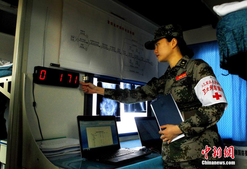 9月23日,解放军代号“卫勤使命——2014”的信息化条件下实兵对抗卫勤保障演习拉开序幕,各参演部队在朱日和训练基地正有序展开训练。演习将依托信息化、现代化、机械化手段,实施伤员定位、战地抢救、前沿接送、远程运输、医院救治及相关要素配合等科目。图为卫生列车医疗队训练。中新社发 宋吉河 摄
