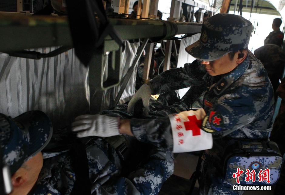 9月23日,解放军代号“卫勤使命——2014”的信息化条件下实兵对抗卫勤保障演习拉开序幕,各参演部队在朱日和训练基地正有序展开训练。演习将依托信息化、现代化、机械化手段,实施伤员定位、战地抢救、前沿接送、远程运输、医院救治及相关要素配合等科目。图为空军医疗队训练。中新社发 宋吉河 摄