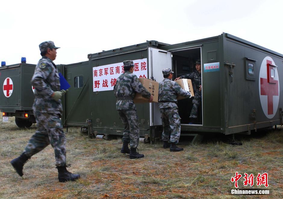 9月23日,解放军代号“卫勤使命——2014”的信息化条件下实兵对抗卫勤保障演习拉开序幕,各参演部队在朱日和训练基地正有序展开训练。演习将依托信息化、现代化、机械化手段,实施伤员定位、战地抢救、前沿接送、远程运输、医院救治及相关要素配合等科目。图为野战血站分队训练。中新社发 宋吉河 摄