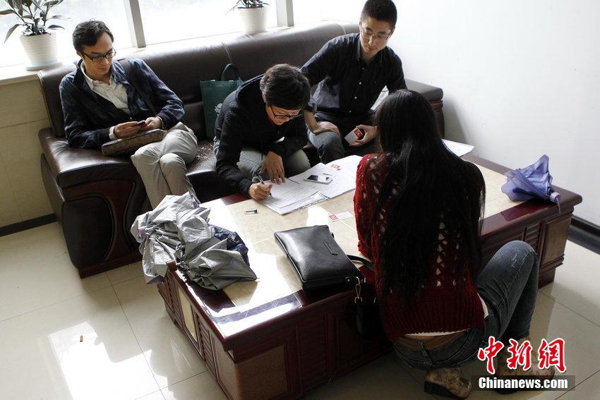 图为黄金佳公司二楼,几名投资者挤在走廊里一张茶几上书写报案材料。 图片来源:CFP视觉中国