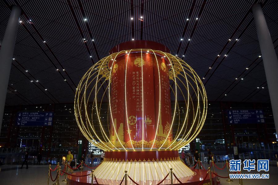 这是9月23日在北京首都国际机场拍摄的巨型灯笼。近日,为迎接新中国成立65周年,一个巨型灯笼亮相北京首都国际机场。该巨型灯笼周身有33根骨架,上下两层花纹由数字65变形而来,配合下方的65架飞机,祝福新中国65岁生日快乐。新华社记者金良快摄