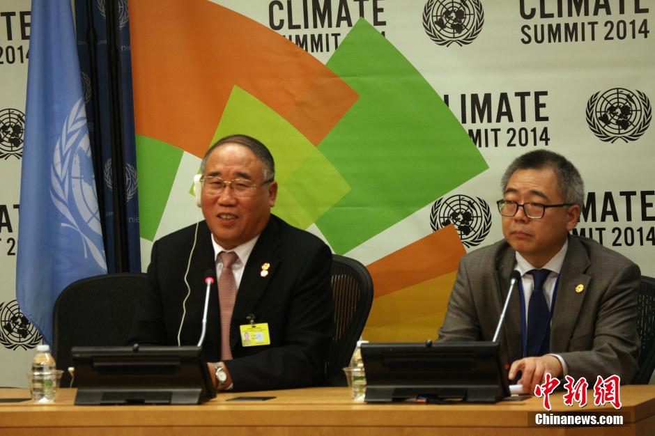 当地时间9月23日,出席联合国气候峰会的中国国家发展和改革委员会副主任解振华(左)在纽约联合国总部举行记者会,阐述中国应对气候变化目标,表示中国言必信行必果。中新社发 李洋 摄