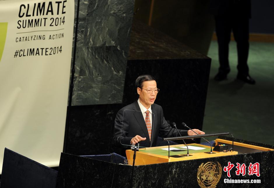 当地时间9月23日,2014年联合国气候变化峰会在纽约联合国总部隆重开幕。 中国国家主席习近平特使、国务院副总理张高丽出席本次联合国气候峰会,并在峰会上作主旨发言,全面阐述中国积极应对气候变化的立场和举措。中新社发 毛建军 摄