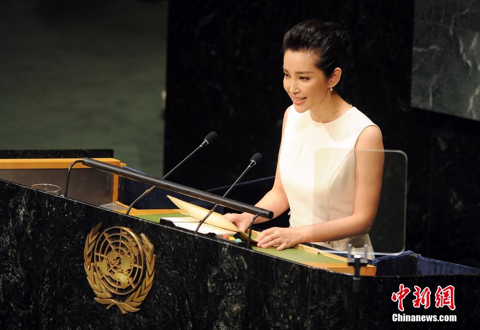 当地时间9月23日,2014年联合国气候变化峰会在纽约联合国总部隆重开幕。中国著名演员、联合国环境规划署亲善大使李冰冰在开幕式上发言。中新社发 毛建军 摄