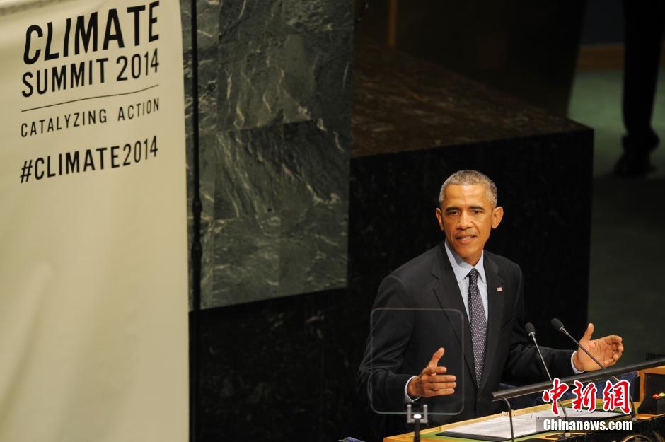 当地时间9月23日,2014年联合国气候变化峰会在纽约联合国总部隆重开幕。 美国总统奥巴马在会上发表主旨演讲。中新社发 毛建军 摄