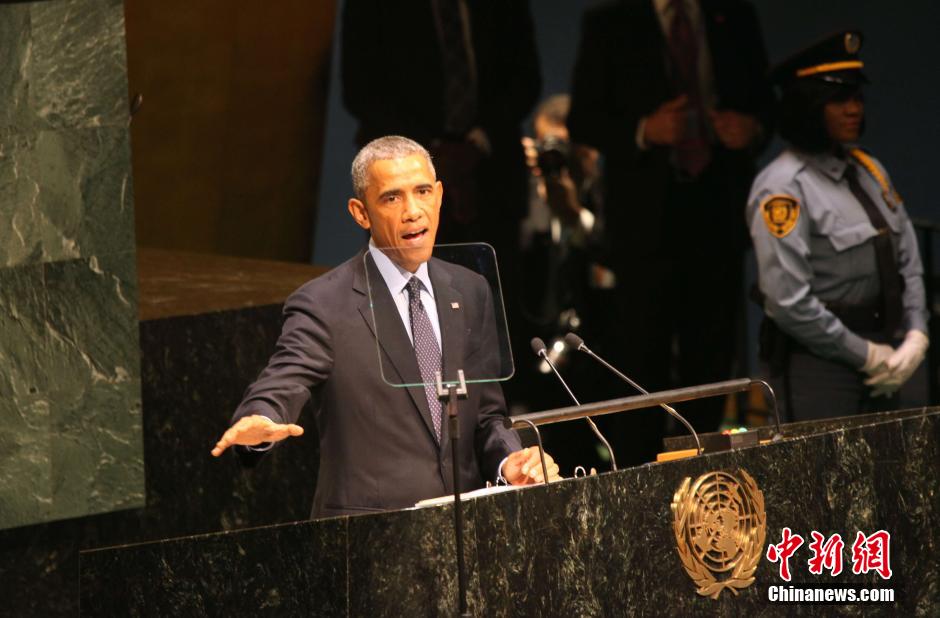 当地时间9月23日,美国总统奥巴马在纽约联合国总部举行的气候峰会上讲话谈论美方应对气候变化措施。他宣布,从即日起,美国联邦当局在国际发展项目和投资中将把气候问题纳入其中。奥巴马还表示,美国将实现所承诺的在2020年前将碳排放水平在2005年的基础上减少17%的目标。中新社发 李洋 摄