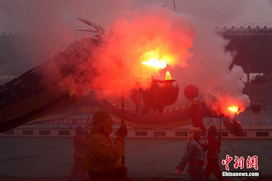9月24日上午,在青岛天泰体育场,一群七旬老人舞起火龙,祝贺市南区第二十一届老年人运动会开幕。据悉,本届运动会共有3000余名60岁至70岁的老人报名参赛。中新社发 徐崇德 摄