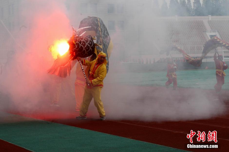 9月24日上午,在青岛天泰体育场,一群七旬老人舞起火龙,祝贺市南区第二十一届老年人运动会开幕。据悉,本届运动会共有3000余名60岁至70岁的老人报名参赛。中新社发 徐崇德 摄
