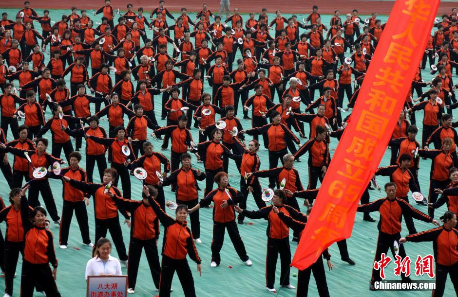 9月24日上午,在青岛天泰体育场,2000名老人共同舞动柔力球,祝贺市南区第二十一届老年人运动会开幕。2014年3月,市南区荣获“中国柔力球之乡”称号。中新社发 徐崇德 摄
