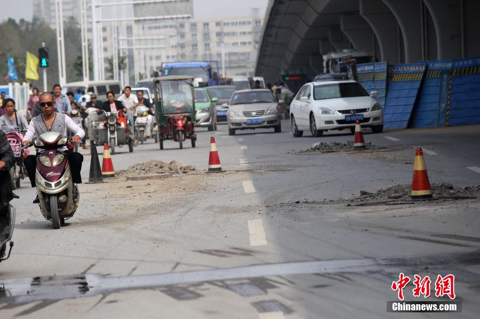 9月24日,河南郑州西三环与中原路交叉口,行人车辆从遮盖塌陷的钢板上穿行,不时传来“嘎吱嘎吱”的声响。郑州西三环在遭遇连续塌陷后,旧痕未愈新伤又至,前些天塌陷的路面还在围挡中修整,接着又迎来了半年内的“15塌”。据统计,郑州市西三环从今年4月份恢复通车以来,已经出现了15次大小不一的塌陷,而西三环中原路路口的塌陷接近10次。中新社发 王中举 摄