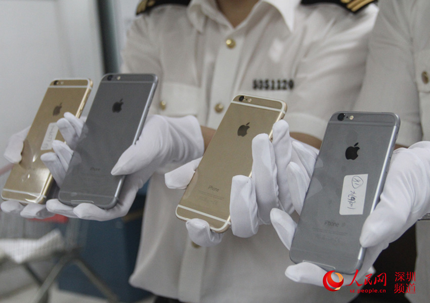 深圳罗湖海关关员展示查获的iPhone 6。(王星 摄)