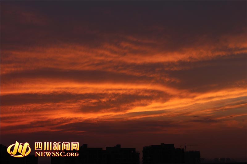 成都:夕阳余晖映红天 晚霞似凤尾绵延舞动