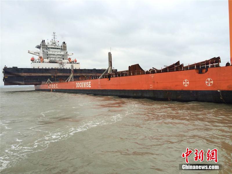 9月24日,亚洲最大半潜船“海洋石油278”号潜入舟山海面完成高难度装卸作业,将名为“NEWCRUZ 282”号和“KREUZ 283”号的两艘小型驳船陆续卸载,并已在舟山中远船务工程有限公司进行为期数周的维修。据悉,在此次造访舟山前,“海洋石油278”刚刚为俄罗斯海军的核潜艇提供过运输服务。并计划于26日安全驶离舟山港,计划装载30多艘小型驳船前往江苏南通港。陈胜男 摄