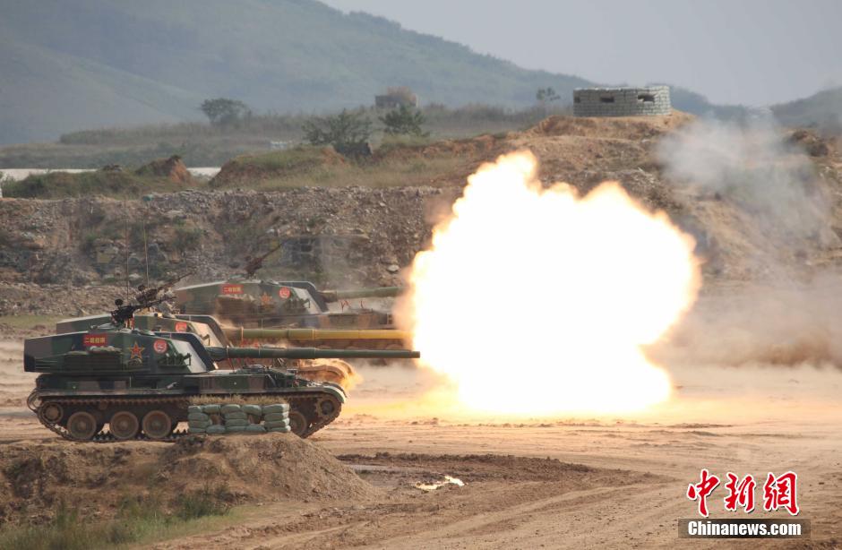 正在南京军区三界训练基地进行的“火力-2014·三界”跨区演习,9月24日上演此次演习的重头戏:济南军区某炮兵旅多种火炮实弹射击。“火力-2014·三界”是今年中国陆军炮兵防空兵部队参加的“火力”系列10场跨区演习中的最后一场。实弹射击是此次演习中最为重要的一个环节。按照“实兵实弹、全系统运用”的要求,检验“侦、控、打、评、保”能力,昼夜实施,演练多手段火力压制、多地段火力拦阻、多层次火力护送、多阵地机动打击、快速反应临机打击,以及组织精确弹药火力拔点、特种弹药火力迷盲等,反坦克火炮、加农炮、加榴炮、火箭炮等多种火炮轮番上阵。中新社发 徐宁 摄