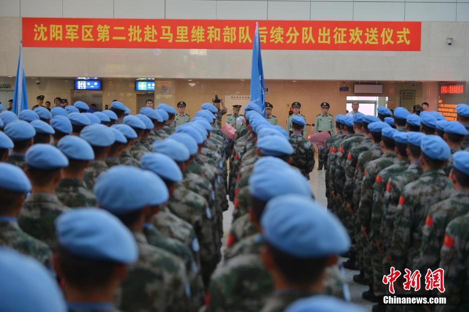 中国第二批赴马里维和部队后续分队205名官兵,9月24日下午从吉林省长春市龙嘉机场乘专机,飞赴非洲马里共和国接替执行维和任务期满的首批维和部队官兵。至此,中国第二批赴马里维和部队395名官兵全部出境奔赴任务区。当天出征的后续分队共205人,其中工兵分队75人、警卫分队90人、医疗分队40人。沈阳军区在机场举行欢送仪式。沈阳军区副参谋长邹小平、陆军第16集团军副政委邵忠海等出席欢送仪式,为维和官兵壮行。中新社发 杨再新 摄