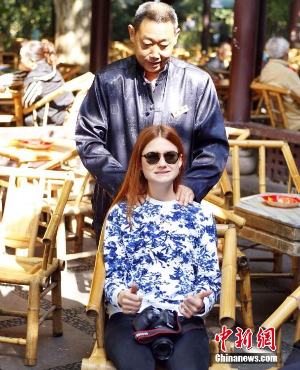 受成都市旅游局和成都文旅集团邀请,《哈利·波特》系列电影中“哈利·波特”女友“金妮·韦斯莱”一角扮演者邦妮·怀特变身“魔幻辣妹”,踏上魅力成都之旅。9月24日,邦妮来到成都人民公园,品味川西民俗,体验地道成都生活,掏耳朵、打麻将、喝功夫茶等给她留下深刻印象。吕强 摄