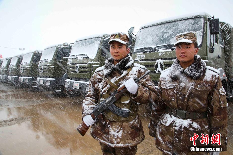 9月24日,执行进藏运输任务的某汽车团车队在运输途中遭遇强风雪。图为运输车队行进在玉珠峰山峰下。青藏公路自开通以来,总后青藏兵站部所属汽车部队官兵长年流动执勤在平均海拔4000米以上的青藏线上,这里被国家划定为“特别艰苦地区”的高寒缺氧地带。中新社发 赵建伟 摄