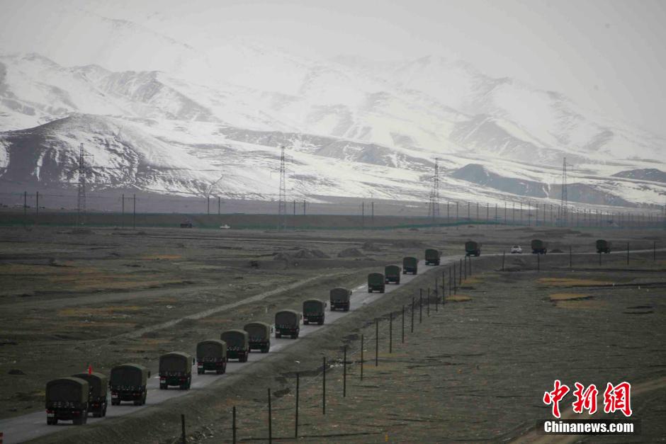 9月24日,执行进藏运输任务的某汽车团车队在运输途中遭遇强风雪。图为运输车队行进在玉珠峰山峰下。青藏公路自开通以来,总后青藏兵站部所属汽车部队官兵长年流动执勤在平均海拔4000米以上的青藏线上,这里被国家划定为“特别艰苦地区”的高寒缺氧地带。中新社发 赵建伟 摄