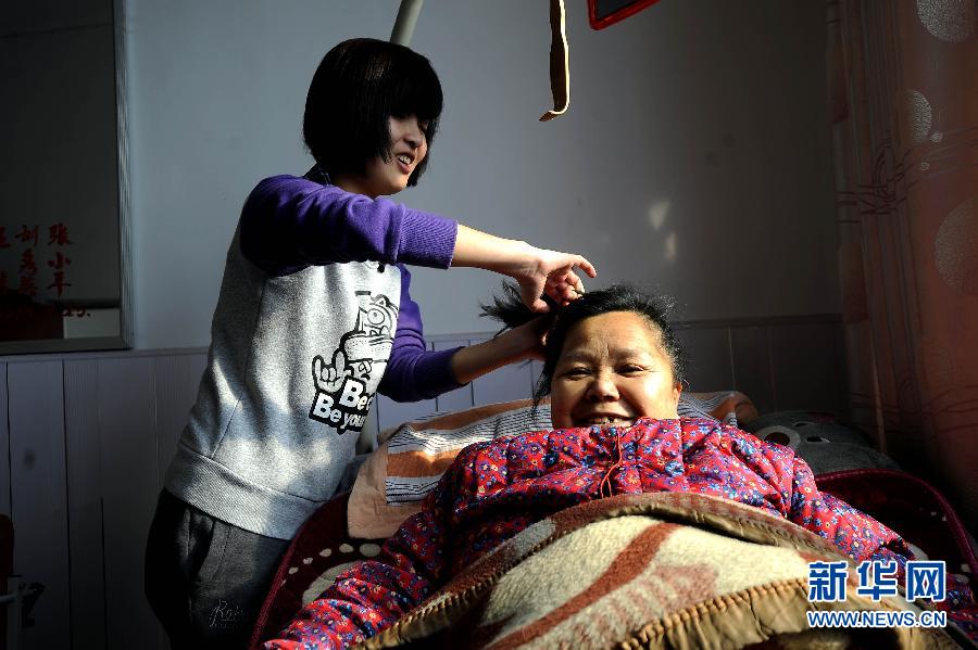孟佩杰为养母刘芳音梳头(1月23日摄)。