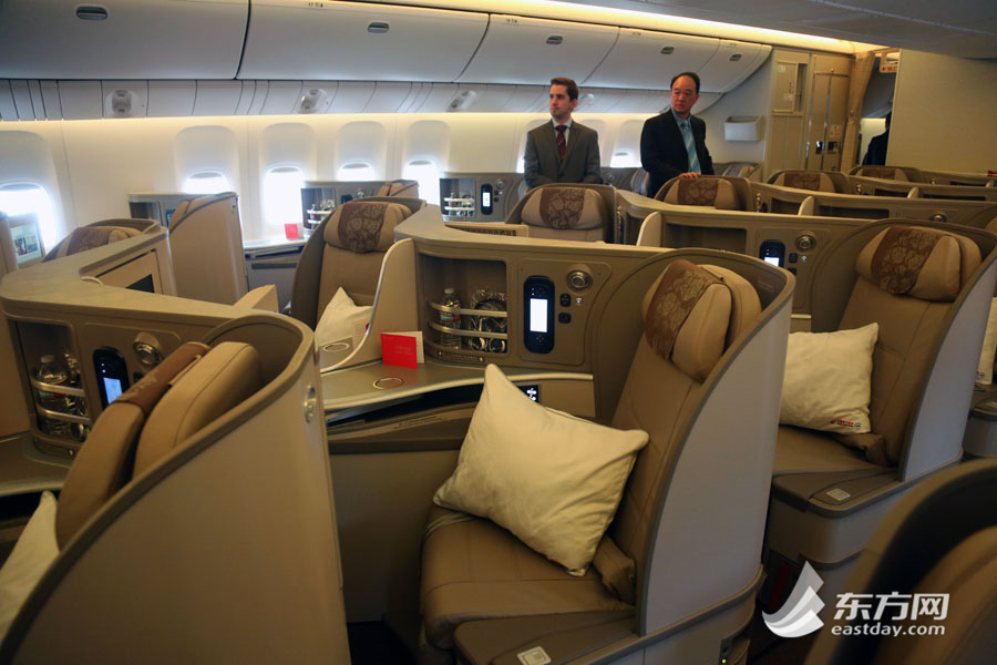图为东航首架波音777-300客机配备52个全平躺公务舱。