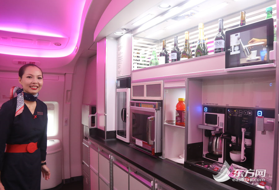 图为东航专门为“空中厨房”配备的研磨式咖啡机、微波炉、电饭煲、烤面包机等均属业界首创或首次应用。