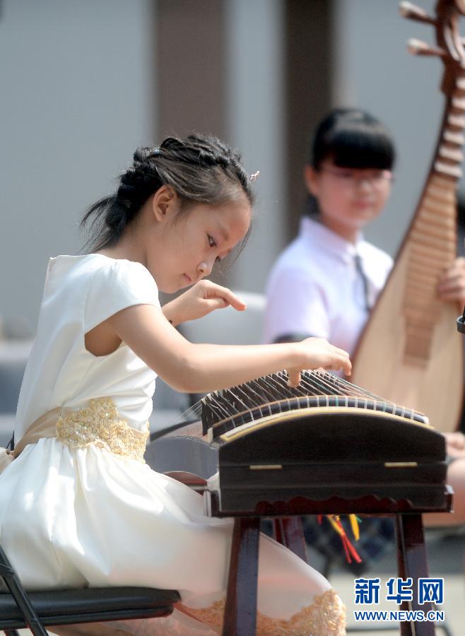 9月26日,来自杭州崇文实验学校的一位小学生在表演古筝《渔舟唱晚》。当日,来自杭州各中小学及在杭州留学的外国留学生数百人参加了在杭州孔庙举行的“中国梦·我的国乐梦”传统文化体验活动。 新华社记者 王定昶摄