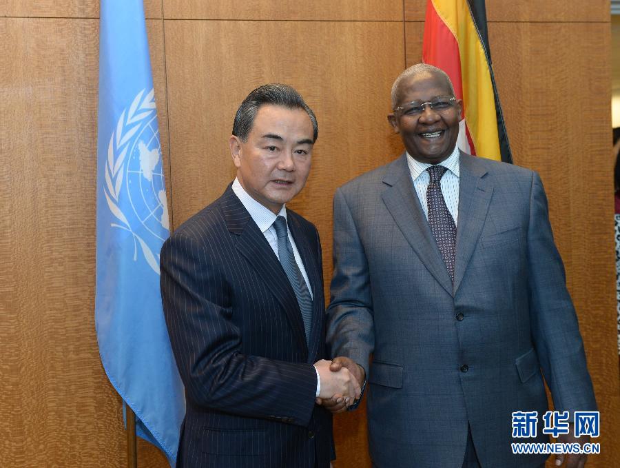 9月25日,中国外交部长王毅(左)在纽约联合国总部出席联大期间会见第69届联大主席库泰萨。 新华社记者殷博古摄