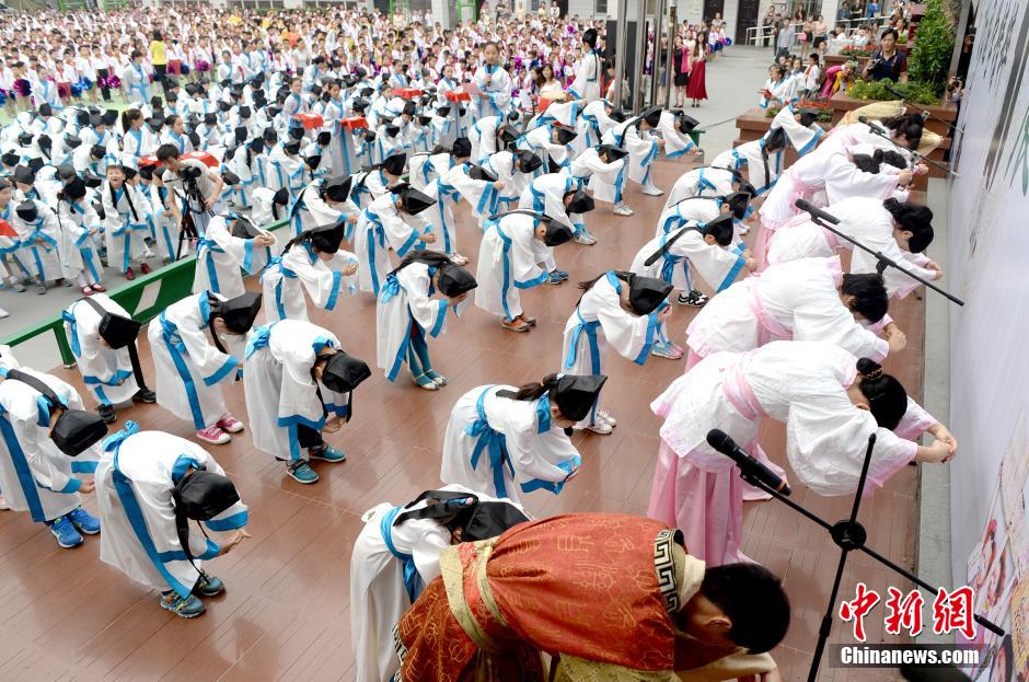 9月26日,合肥市乐农新村小学一年级新生向自己的老师们行拜礼。国庆到来前夕,安徽省合肥市蜀山区一小学刚刚入学的百余名一年级新生和他们的老师身着传统汉服,行传统拜师礼节,让孩子们从小感受中国传统文化,树立尊师重教的观念。中新社发 张娅子 摄