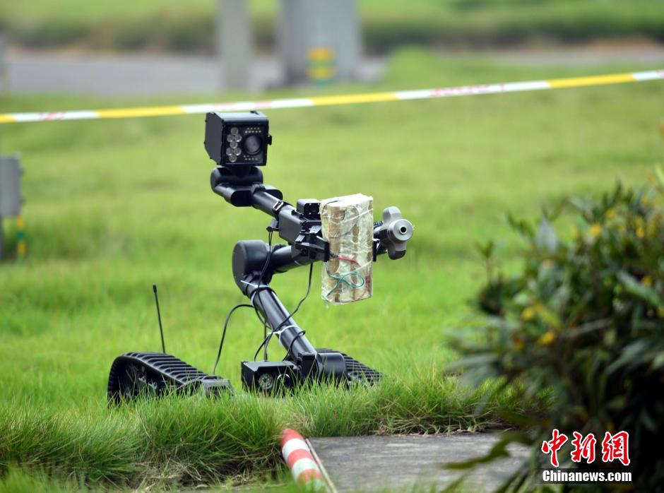 9月26日,在国庆黄金周即将到来之际,湖北宜昌警方在国家电网宜都换流站开展了一次反恐应急演练,对排爆防爆、反劫持等科目进行了演练。演练中,三名“暴徒”在换流站劫持人质并制造“爆炸”,警方经过工作后,将“暴徒”“击毙”2名,“抓获”1名。在此过程中,警方展示了各种新式装备,其中排爆机器人惊艳亮相。宜昌是三峡工程和葛洲坝水电工程所在地,是国家重要能源基地,宜都换流站是西电东送的重要通道,担负着将三峡水电送至华东的重任。刘良伟 摄