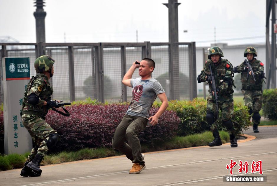 9月26日,在国庆黄金周即将到来之际,湖北宜昌警方在国家电网宜都换流站开展了一次反恐应急演练,对排爆防爆、反劫持等科目进行了演练。演练中,三名“暴徒”在换流站劫持人质并制造“爆炸”,警方经过工作后,将“暴徒”“击毙”2名,“抓获”1名。在此过程中,警方展示了各种新式装备,其中排爆机器人惊艳亮相。宜昌是三峡工程和葛洲坝水电工程所在地,是国家重要能源基地,宜都换流站是西电东送的重要通道,担负着将三峡水电送至华东的重任。刘良伟 摄