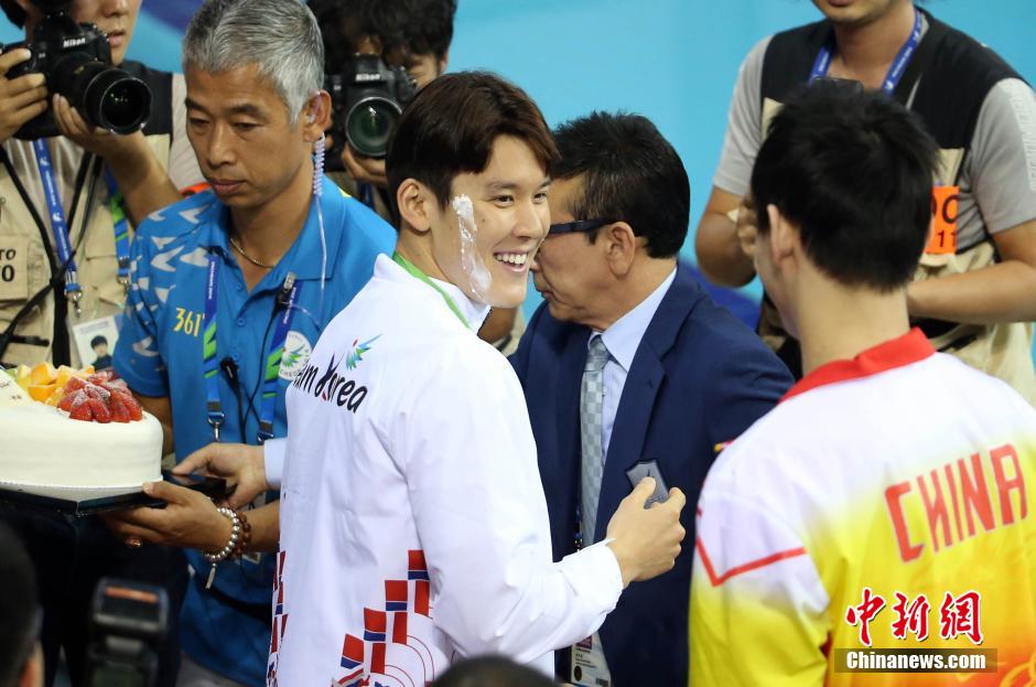 9月26日晚,仁川亚运会游泳比赛在文鹤朴泰桓游泳馆全部结束。赛后,中国选手孙杨手捧蛋糕为朴泰桓提前庆祝生日。中新社记者 汤彦俊 摄