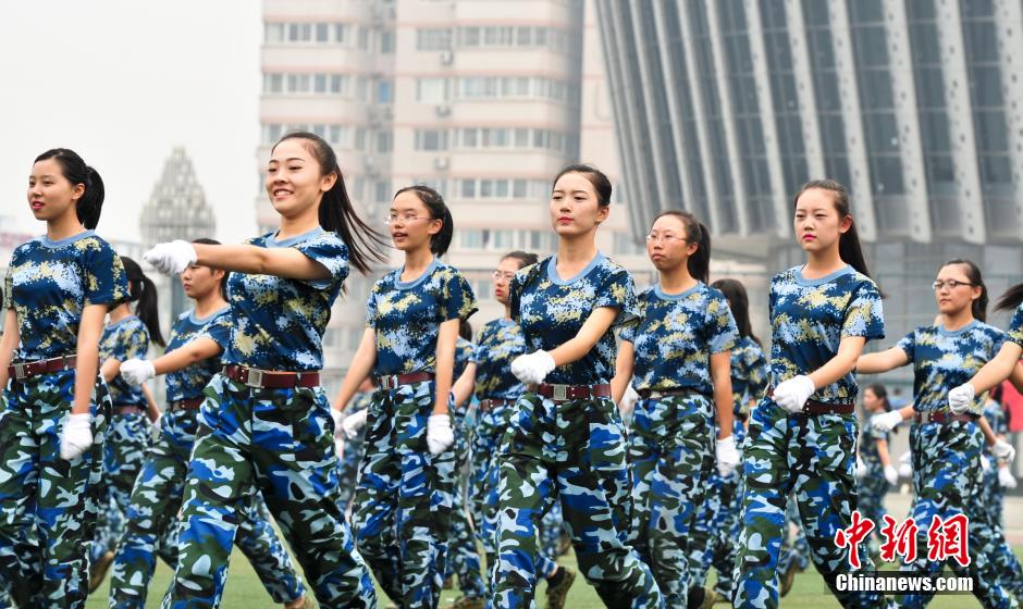 9月27日,山东大学2014级学生军训阅兵典礼在济南举行,女大学生持枪上阵,演练擒拿格斗一招制敌,飒爽英姿尽显“女汉子“霸气。中新社发 张勇 摄