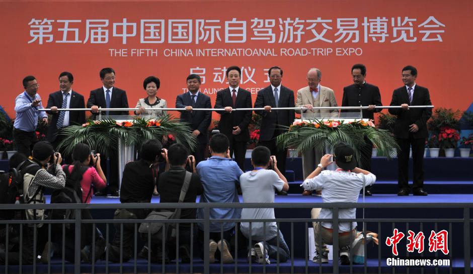 9月27日,第五届中国国际自驾游交易博览会在四川乐山峨眉山市正式启动,来自海内外的嘉宾将参与经典自驾旅游线路产品展示推广,国内外知名品牌自驾车辆、房车展示及体验,自驾及户外用品和设备展示,越野车互动表演等。图为嘉宾共同推杆启动第五届中国国际自驾游交易博览会。 刘忠俊 摄