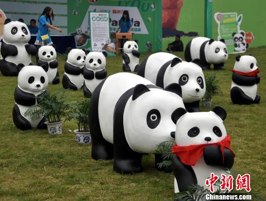 系着红领巾的大熊猫雕塑憨态可掬。朱敏 摄