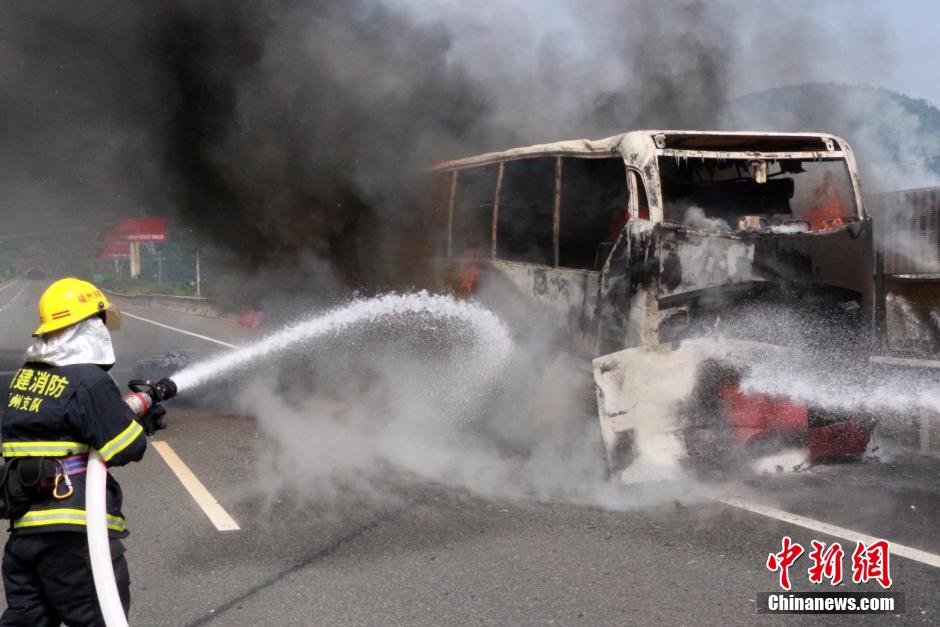 9月28日中午,沈海高速路厦门往福州方向南岭隧道前2公里处一辆大客车在行驶途中突然起火,30余名乘客安全逃生。起火后,客车司机立马拨打119报警电话求助。接警后,福清市宏路消防中队迅速出动一辆水罐消防车、7名官兵赶赴现场进行扑救。随后,消防官兵与高速交警对现场进行警戒封锁,并架设起水枪,对火势进行控制,25分钟后大火被扑灭。目前,起火原因正在进一步调查当中。中新社发 钟欣 摄