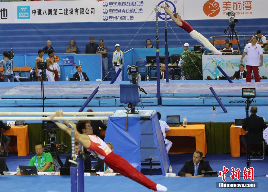 第45届世界体操锦标赛资格赛,10月4日在广西南宁展开第二天的争夺。图为不同赛场的选手姿势相似,仿佛镜像。王刚 摄